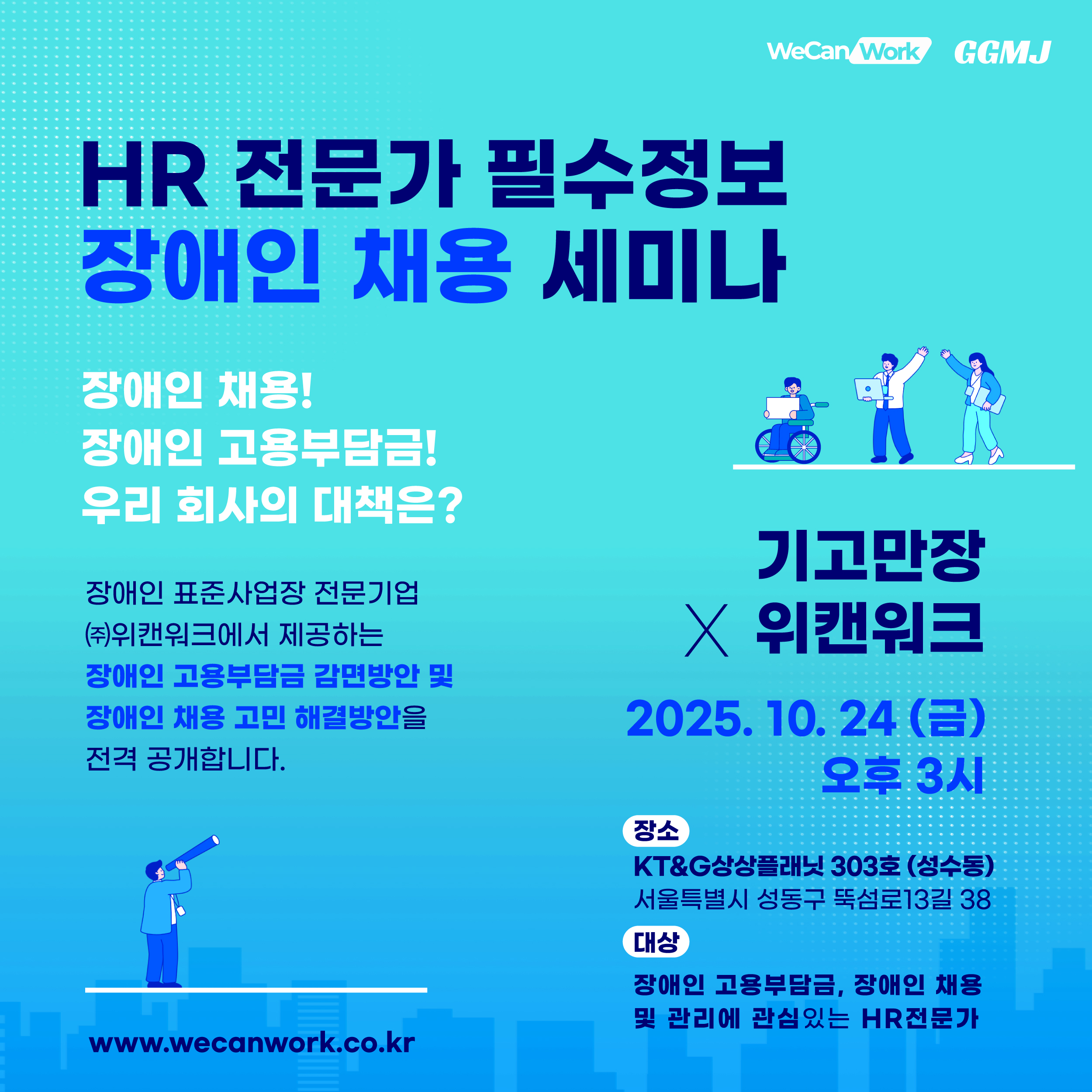 기고만장 X 위캔워크가 공동 주최하는 ‘장애인 채용 세미나’에 HR 전문가 여려분을 초대합니다. 매년 이맘때가 되면 년초에 납부해야 하는 장애인 고용부담금이 큰 고민거리입니다. 이번 세미나에서는 내년에 예상되는 정부의 장애인 고용정책의 변화와 아울러 장애인채용과 장애인 고용부담금 솔루션인 ‘위캔워크모델’을 소개하며 실제 적용사례를 통해 도입 효과를 증명합니다.